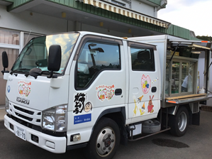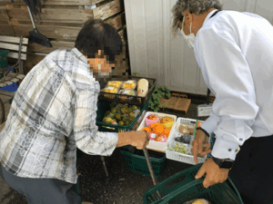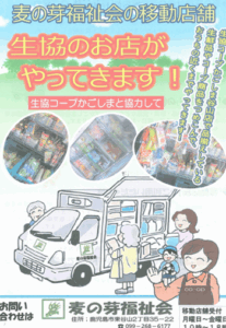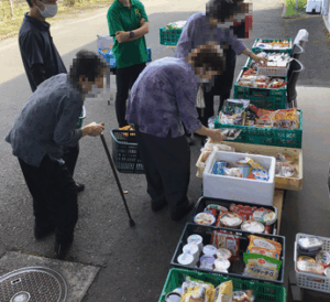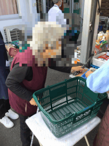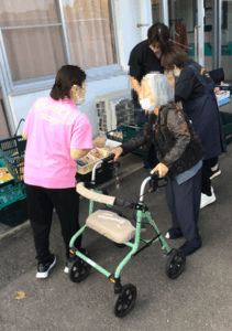 地域でおなじみの「麦の芽福祉会 ハートとハートをつな号」がやってきて、新鮮な野菜やお菓子、日用品などをいっぱい運んできてくれました。